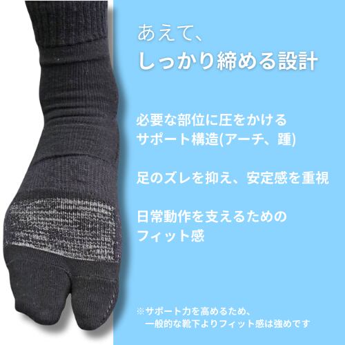 足のズレを抑え、日常動作をサポートする構造を採用しています。