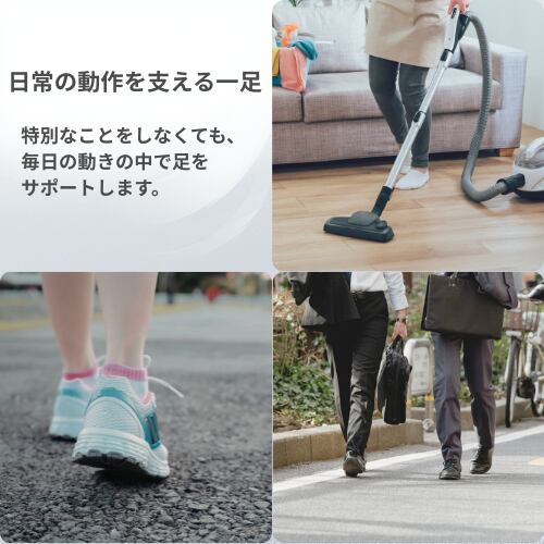 足のズレを抑え、日常動作をサポートする構造を採用しています。